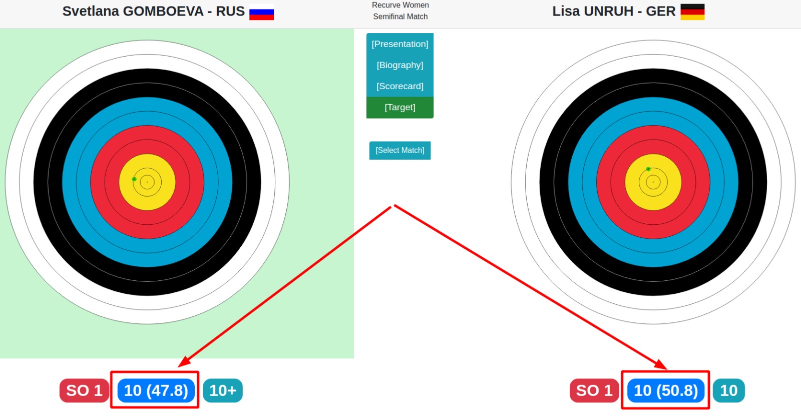 In the semi final at the Hyundai Archery World Cup Stage 2 in Lausanne (17.-23. Mai 2021) there was a shoot out between Lisa Unruh and Svetlana Gomboeva. A single arrow decides who is going to participate in the final. It was a very tight decision. RyngDyng measured a difference of only 3 mm, see sceenshot of the I@nseo management software below.