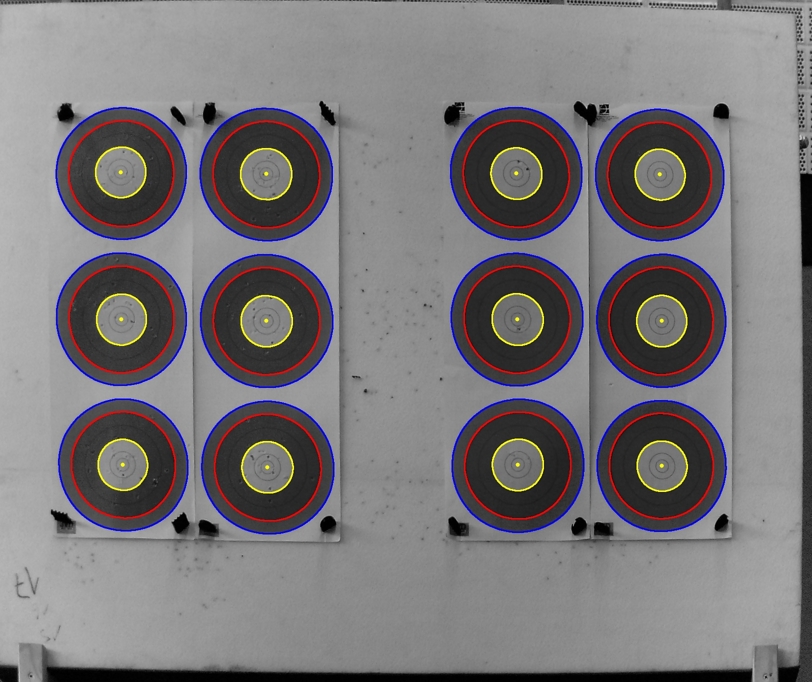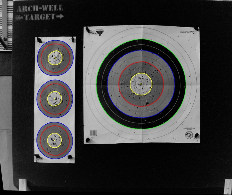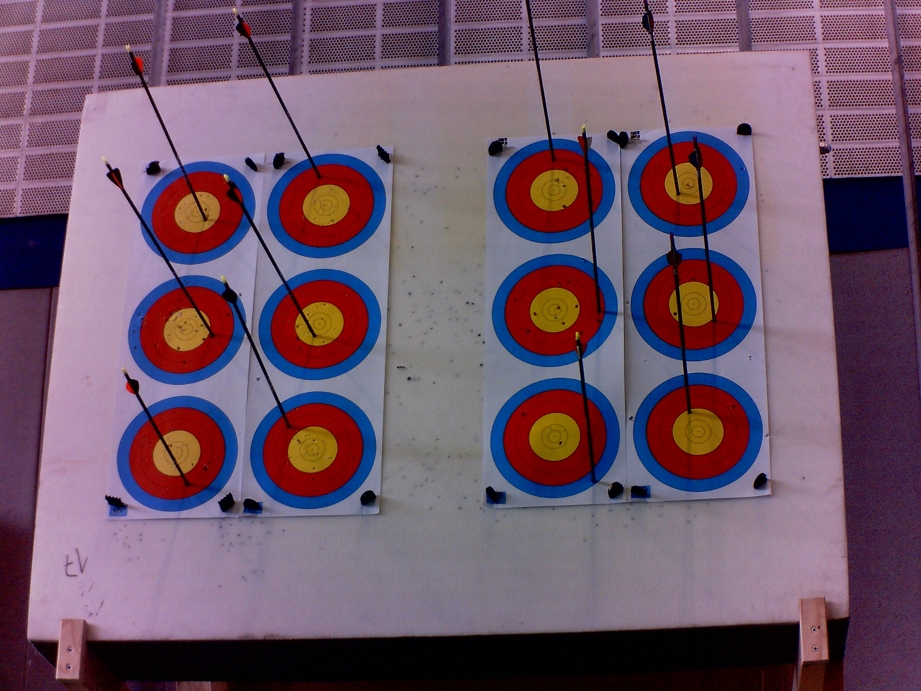 Below you can see a situation in our last indoor training session using 4 vertical spots. The first image shows the calibration RyngDyng did for these target faces. The second image shows an end of the training session. All arrows have been detected and recorded. For RyngDyng it doesn't matter whether the arrows arrive at the same point in time or one after another.
