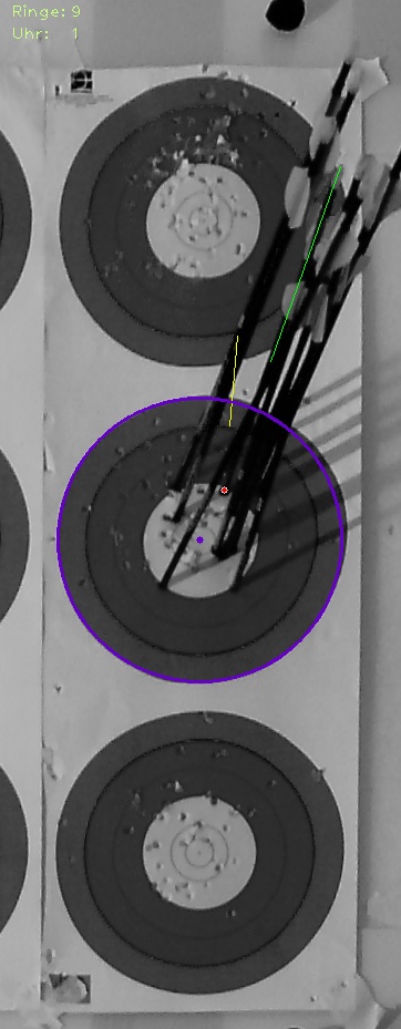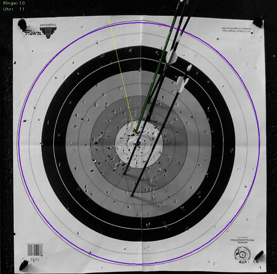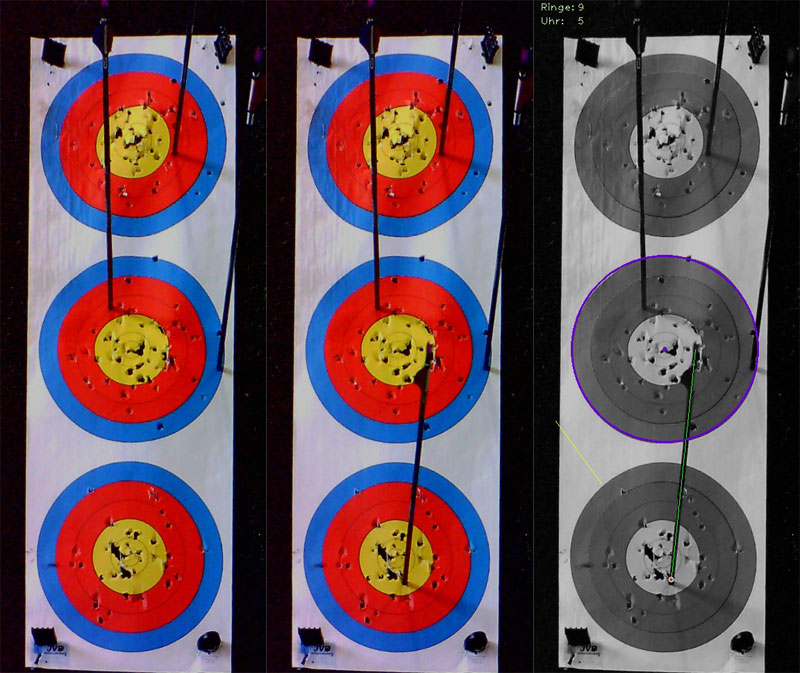 We did a performance test and shot 11 arrows on a single spot target. RyngDyng detected all arrows correctly. The first image shows the view from the left camera right before the last arrow arrived. The second image shows the same view right after the last arrow did arrive. The difference between these two images is good enough for RyngDyng to calculate the position of the arrow. The result of the computation is shown in the third image. The detected arrow is marked with a red dot.