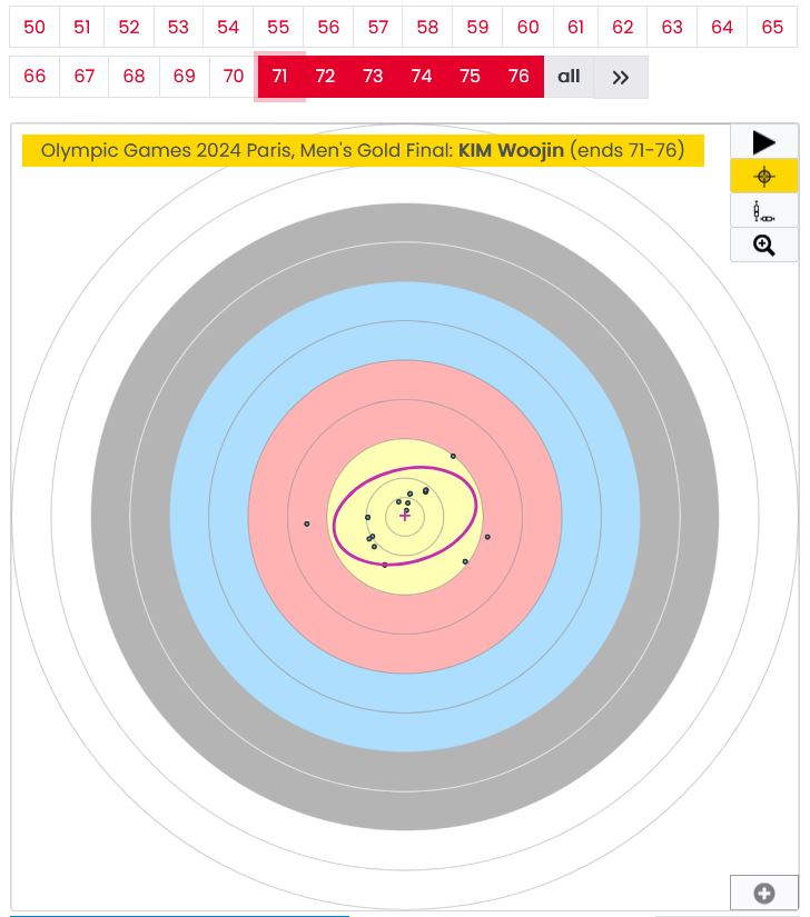 By clicking on the end numbers you get an overlay of several ends in one image (in the example above: ends 71 to 76). Below the target face you will find the statistical numbers for the displayed arrows. These numbers allow to compare the performance of the archers in very detail. To reach the finals, you should achieve an AGI greater than 95 (AGI = Arrow Grouping Indicator). Some archers achieved 98!