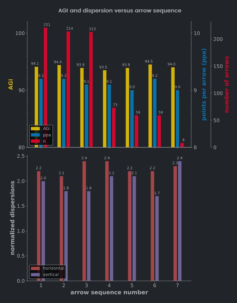 Let's focus on the first 3 shots of each end (arrow sequence numbers 1, 2 and 3). You will find that the third shot has a lower points per arrow figure (ppa, blue bars): 9.1 versus 9.2 for the first two shots. Also the AGI figure (yellow bars) for all 3rd shots is lower, that is they are more scattered than the first and second shots.