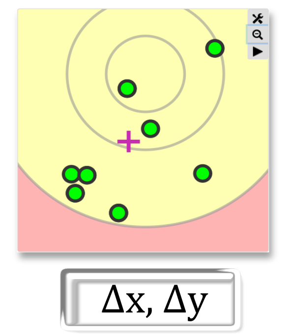 For every group of arrows the center of the group and the relative shift of the group center is calculated. This helps to adjust the sight, and is also used for bare shaft testing when tuning bows.
