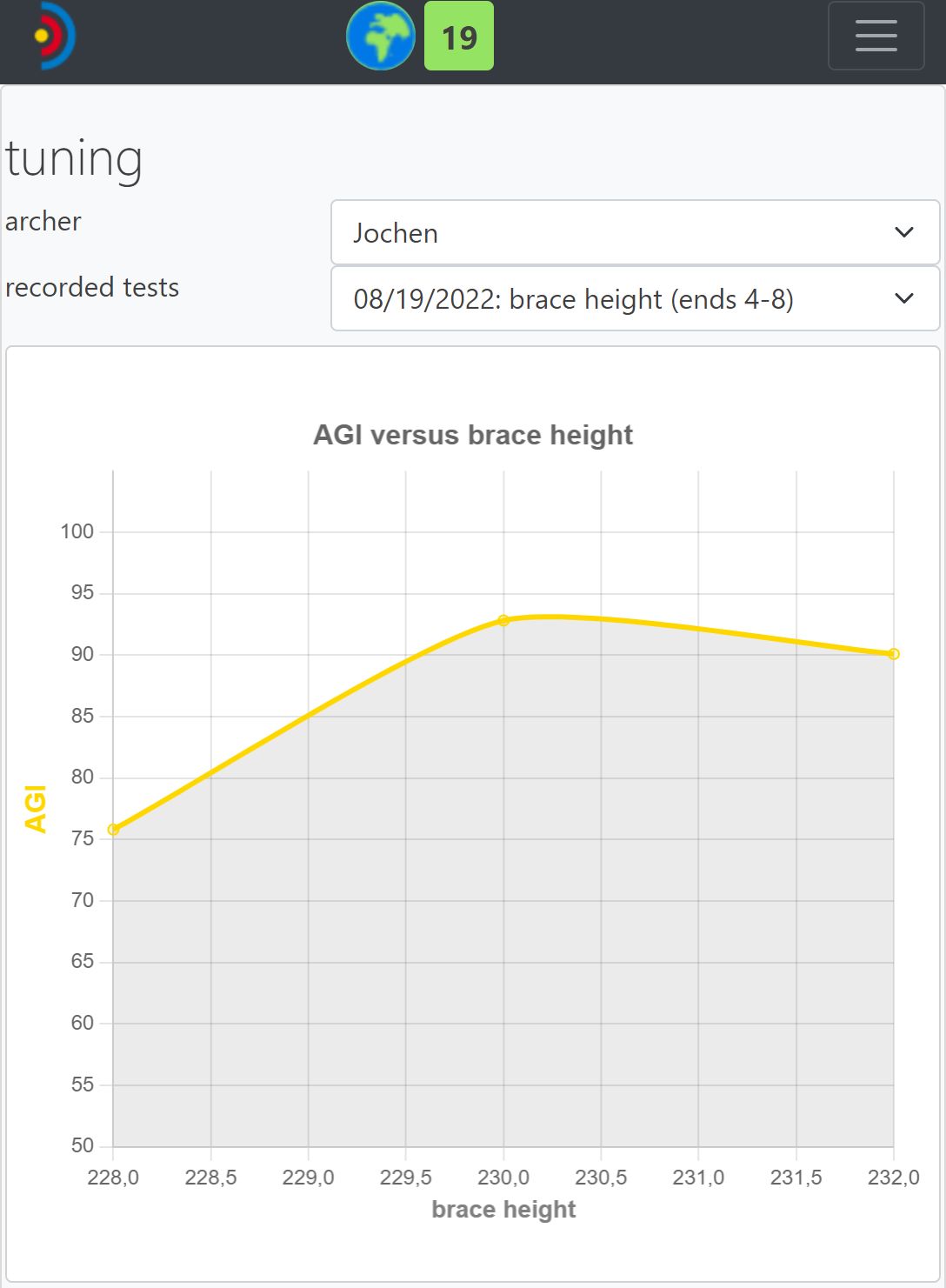 The brace height of 230 has reached the highest AGI value and thus the smallest group of arrows. This brace height is therefore optimal.