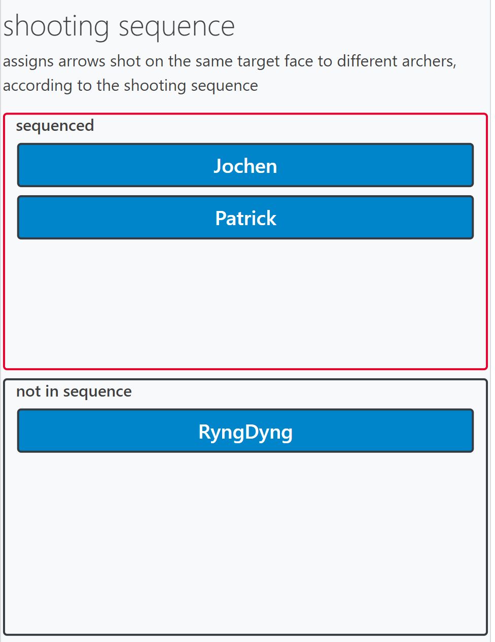 If there is a connection to a RyngDyng and several archers have been created, a shooting sequence can optionally be defined. This is helpful if several archers share a target face and the arrows should still be assigned separately to the individual archers. Arriving arrows are then assigned in turn according to the defined shooting sequence and can thus later be evaluated separately by archer.