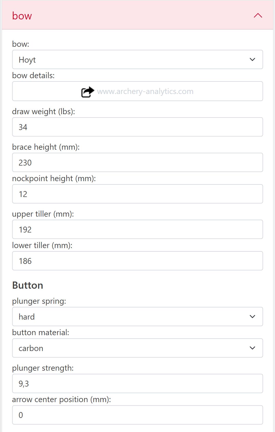 ). The material can then be selected in the app using the drop-down menu (see selection bow on the left in the image, arrows and tab/release on the right). In general, only those parameters for the bows that can also be changed on site are entered in the app. Unchangeable characteristics are stored in the server.