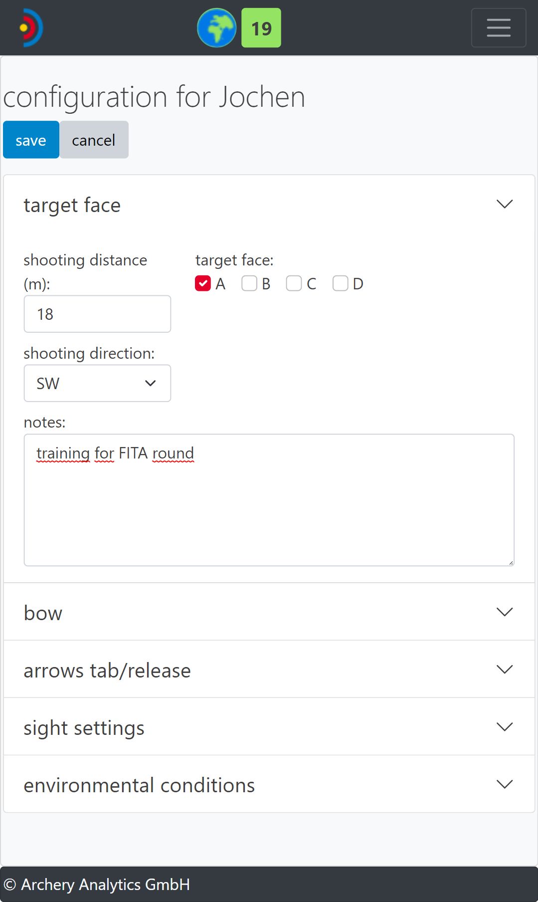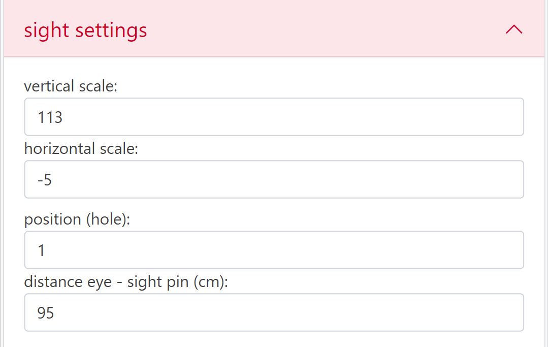For each displayed end or overlay of ends, tips for sight adjustment can also be called up on the hits page (except for bare bows). In order for this to be possible, some information must be available. The features of the sight should be stored on the server (thread of the sight screws and number of clicks per revolution), and the current distance between the eye and the front sight should be entered in the app. Then the app can calculate how many clicks the sight screws should be adjusted horizontally and vertically to get the arrow group into the center of the target.