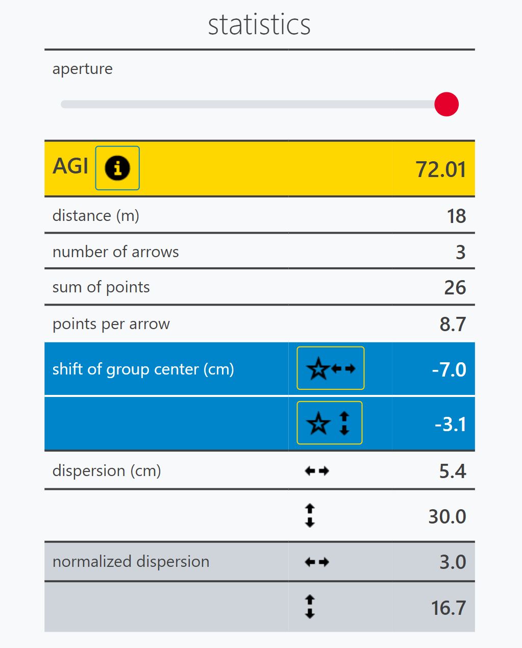 Below the display of the face, the current key figures are also displayed (left image below). All displayed hits are included in the calculation. If several ends are superimposed or if all ends are displayed at the same time, the statistical statements become very significant (e.g. the position of the center point of the arrow group or the Arrow Grouping Indicator AGI). Outliers can be removed from the key figures of the statistics using the slider for the aperture (picture on the right).
