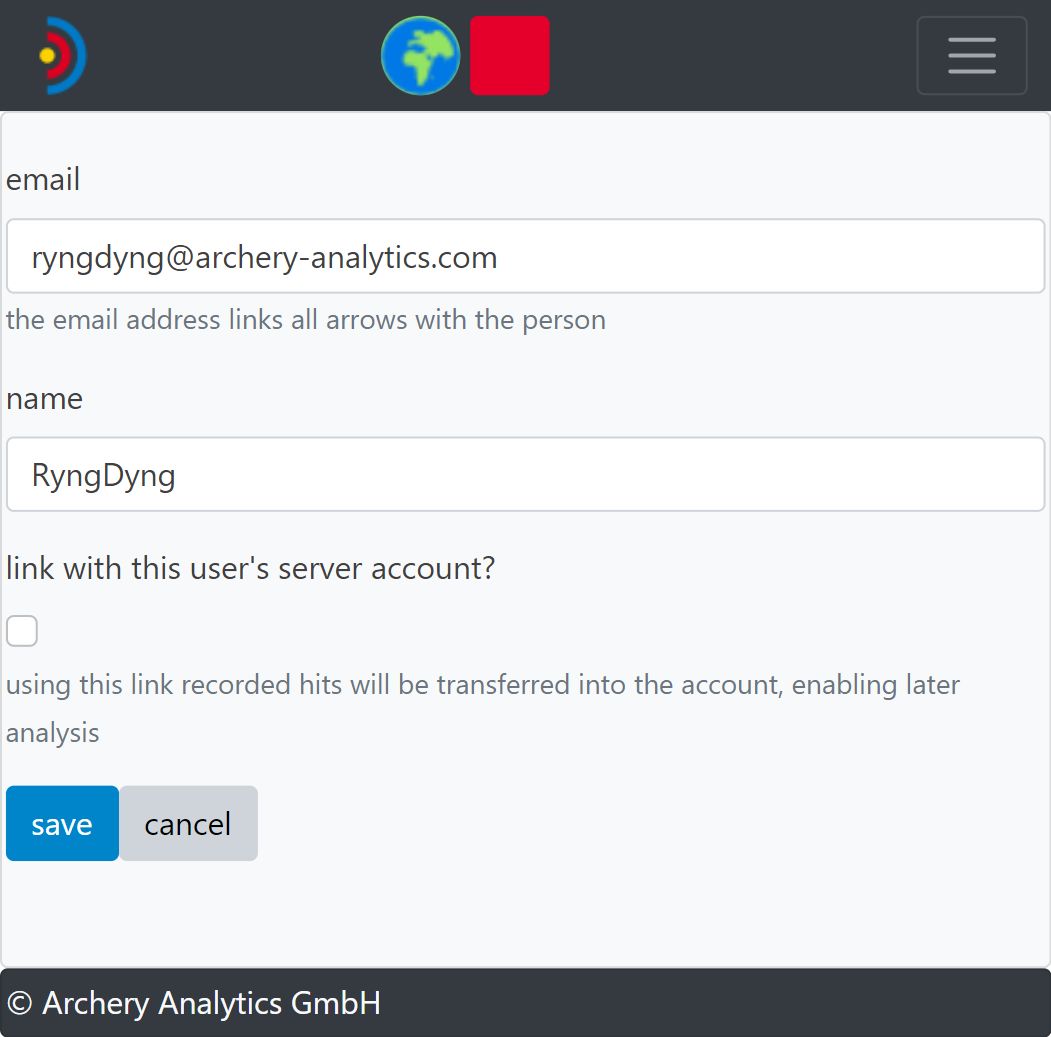 After pressing the add archer button, the left mask appears. If this person already has an account on Archery Analytics' server, you can also enter the access data for the account (right image). This will connect the app to the server account and all detected arrows will be transferred to the server. More details are described in the document