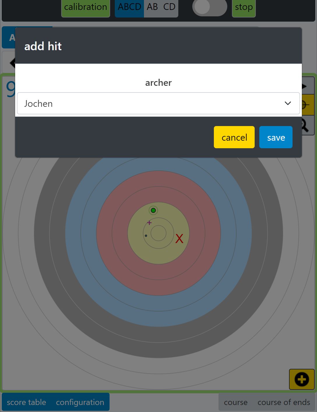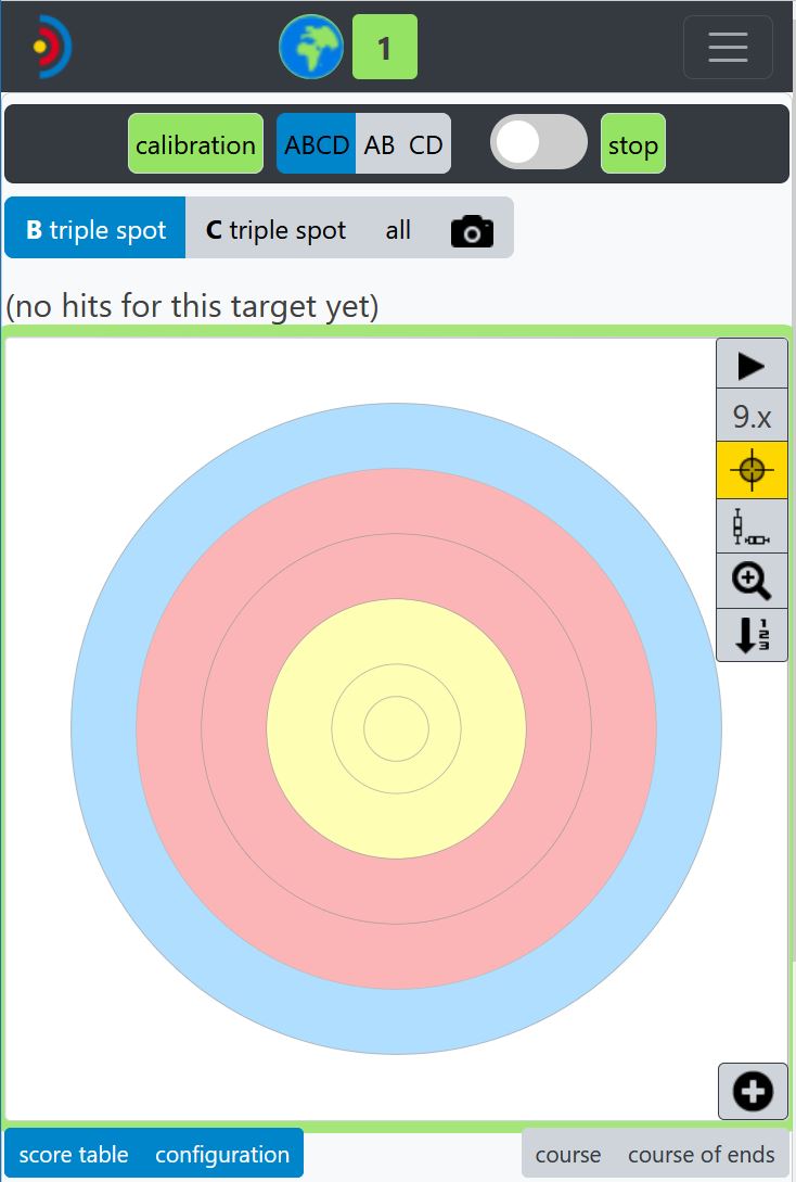 calibrationpage (e.g. to check the quality) - ABCD, AB, CD: Switching like in competition. For example, if the left spot has the letters AC and the right spot has the letters BD, then all arrows are assigned to shooters A (left) and B (right) when AB is active.