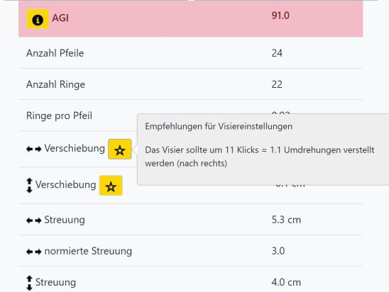 RyngDyng kann dir sehr genaue Hinweise zur Visiereinstellung geben. Dafür musst du lediglich in der Ansicht 'Auswertung' gespeicherte Treffer abrufen und anzeigen lassen (z.B. die 3 letzten geschossenen Passen). Dann auf den gelben Hinweis-Knopf neben 'Verschiebung' klicken.