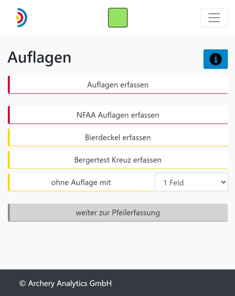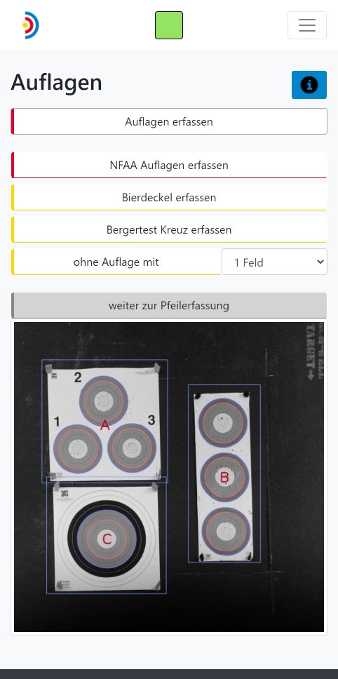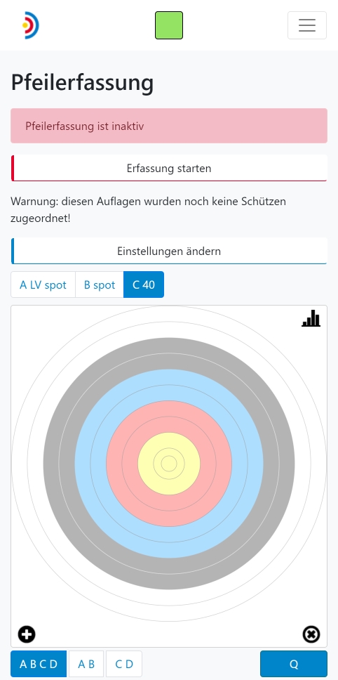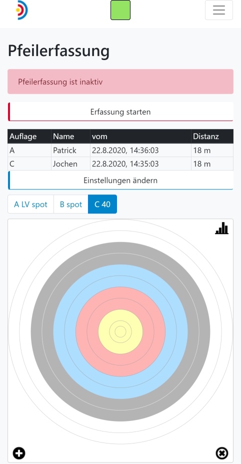 Die für den eigentlichen Betrieb wichtigste Ansicht ist die 'Pfeilerfassung'. Hier kannst du die Pfeilerfassung starten und stoppen sowie das Eintreffen aller Pfeile live verfolgen.