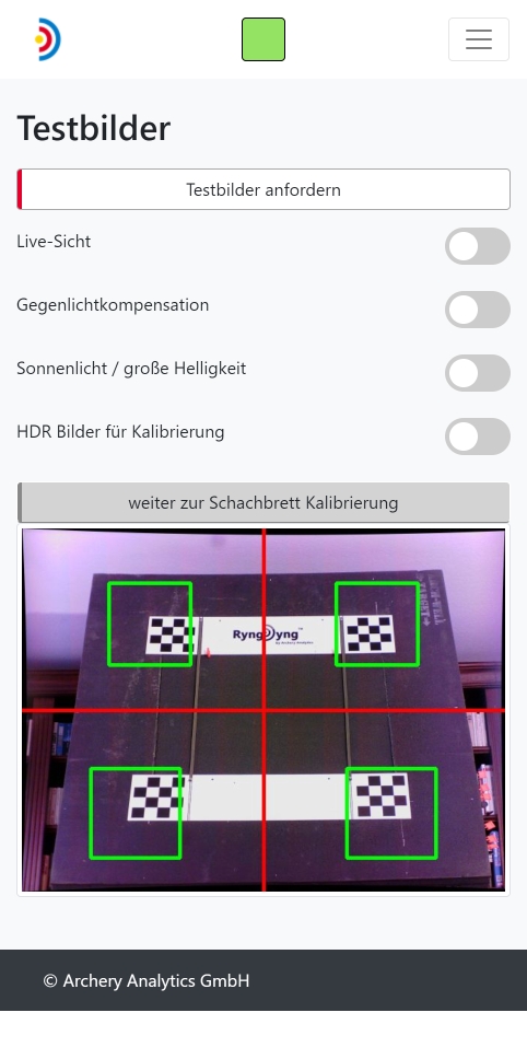 Das rechte Bild zeigt die Seite für das Abrufen von Testbildern. Diese dienen dazu, die Kameras mittig auf die Scheibe auszurichten. Insbesondere im unebenen Gelände wird man auf diese Weise den Stand nachjustieren. In einer Halle passt in der Regel der Standort, wenn du das RyngDyng© drei Kofferlängen = 285 cm vor der Scheibe mittig aufstellst. Das Fadenkreuz in den Testbildern erleichtert dir die Ausrichtung.