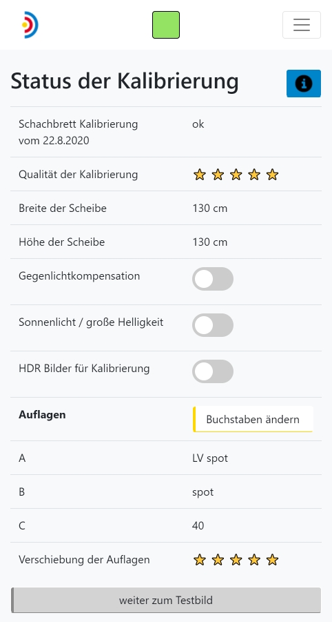 Das linke Bild zeigt den Überblick über im RyngDyng© vorhandene Kalibrierungsdaten nach vollständig durchgeführter Kalibrierung. Zudem kannst du hier Einstellungen für spezielle Lichtsituationen vornehmen, wie z.B. Gegenlicht oder für helles Sonnenlicht.