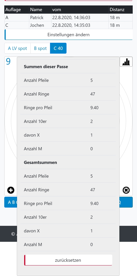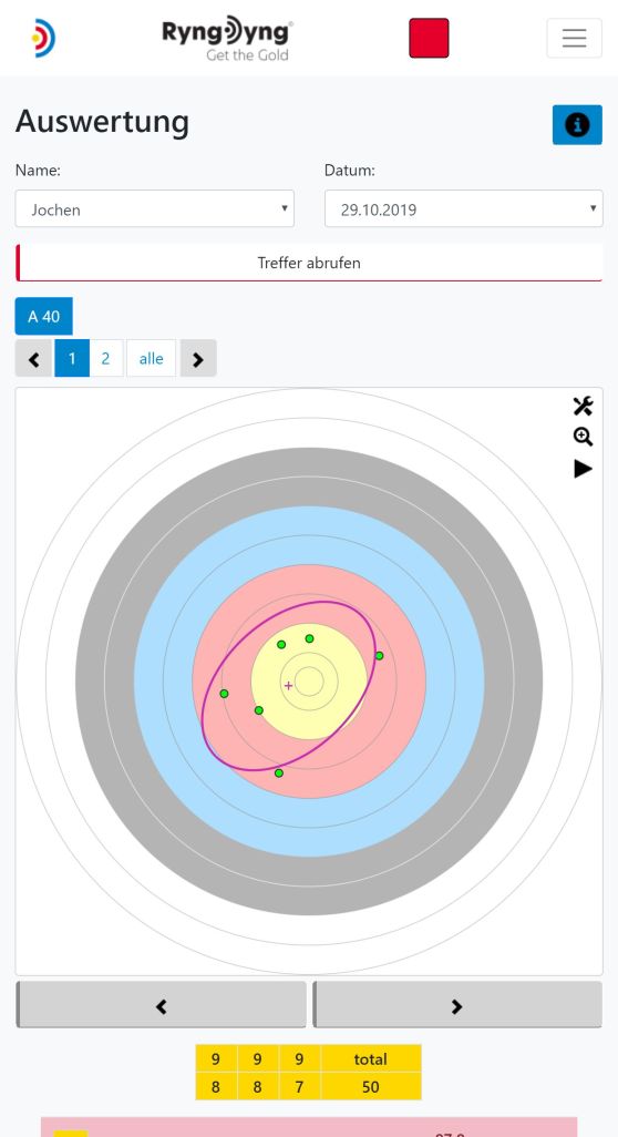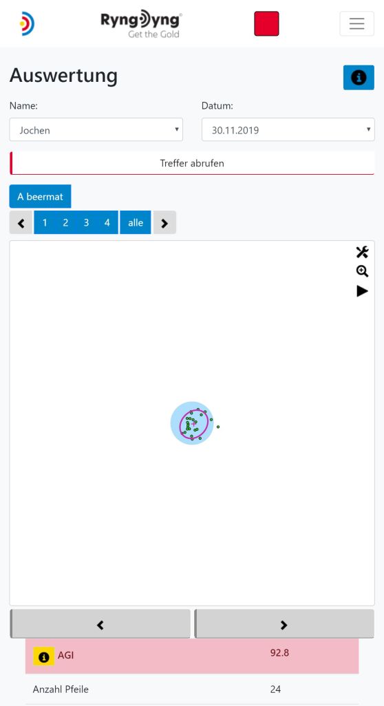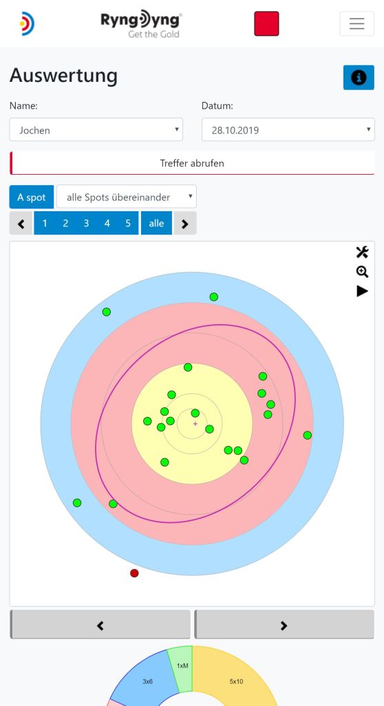 Grundsätzlich speichert die RyngDyng© App alle Treffer, die zu den angelegten Personen gehören. Du wählst also zuerst die betreffende Person aus und danach den Tag, zu dem die Treffer analysiert werden sollen. Nachdem die Treffer abgerufen wurden, siehst du, auf welche Auflagen an dem ausgewählten Tag geschossen wurde und welche Passen aufgezeichnet wurden.