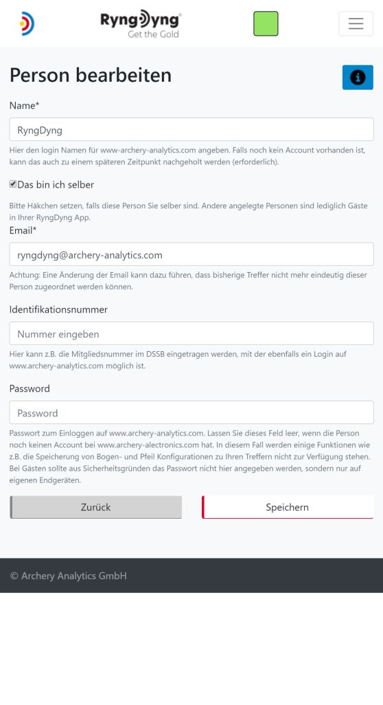 Hast du einen gültigen Archery Analytics Accounts, so ändert sich nach dem Speichern der Funktionsumfang der RyngDyng App. Als registrierter Bogenschütze hast du nach dem Speichern die Möglichkeit, weitere Personen anzulegen, und somit z.B. Gäste mit auf deine Scheibe nehmen können. Als Eigentümer eines RyngDyng Systems kannst du mit der App alle Einstellungen am System vornehmen.