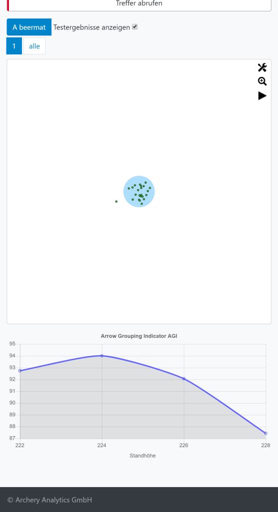 In allen Anleitungen zum Bogentuning findet man den Hinweis, dass bestimmte Einstellungen wie z.B. die Standhöhe dann optimal sind, wenn die Pfeile die beste (= engste) Gruppierung aufweisen. Die RyngDyngApp© unterstützt dieses Tuning, indem sie zu jeder Passe den Arrow Grouping Indicator AGI berechnet. Dieser ist einfach zu verstehen: 100 bedeutet, dass alle Pfeile der Passe auf einem Punkt stecken, 0 bedeutet, dass alle Pfeile maximal über die Auflage verstreut sind. Natürlich kannst du 100 nur dann erreichen, wenn du z.B. 3 Pfeile auf einen 3er Spot schießt und jeder Pfeil auf demselben Punkt im jeweiligen Spot steckt. Um 'alle im Gold' zu haben, solltest du wenigstens 95 erreichen. Der AGI wird übrigens so berechnet, dass er von der Entfernung unabhängig ist. Eine sehr enge Gruppe auf 18 m Distanz kann denselben AGI haben wir eine größere Gruppe auf 70 m Distanz. Entscheidend ist die Gruppengröße im Verhältnis zur Auflagengröße.