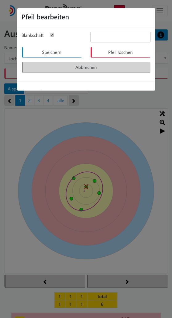 RyngDyng unterstützt Blankschaft Tests, indem du in jeder Passe die Blankschäfte als solche kennzeichnen kannst. Weiterhin wird die Lage der Blankschäfte relativ zur Gruppe der befiederten Pfeile sehr genau ausgewiesen - sofern du genügend Pfeile geschossen hast. Im linken Bild siehst du, wie ein angeklickter Pfeil als Blankschaft markiert wird. Im rechten Bild siehst du die Überlagerung von von 4 Passen, die insgesamt 6 Blankschäfte enthalten (blau dargestellt). Die RyngDyng App berechnet automatisch die Position der Blankschäfte separat von der Position der befiederten Pfeile, so dass du durch Vergleich der Ellipsen sofort sehen kannst, wo das Zentrum der Blankschäfte im Vergleich liegt und wie die Streuung sich unterscheidet.