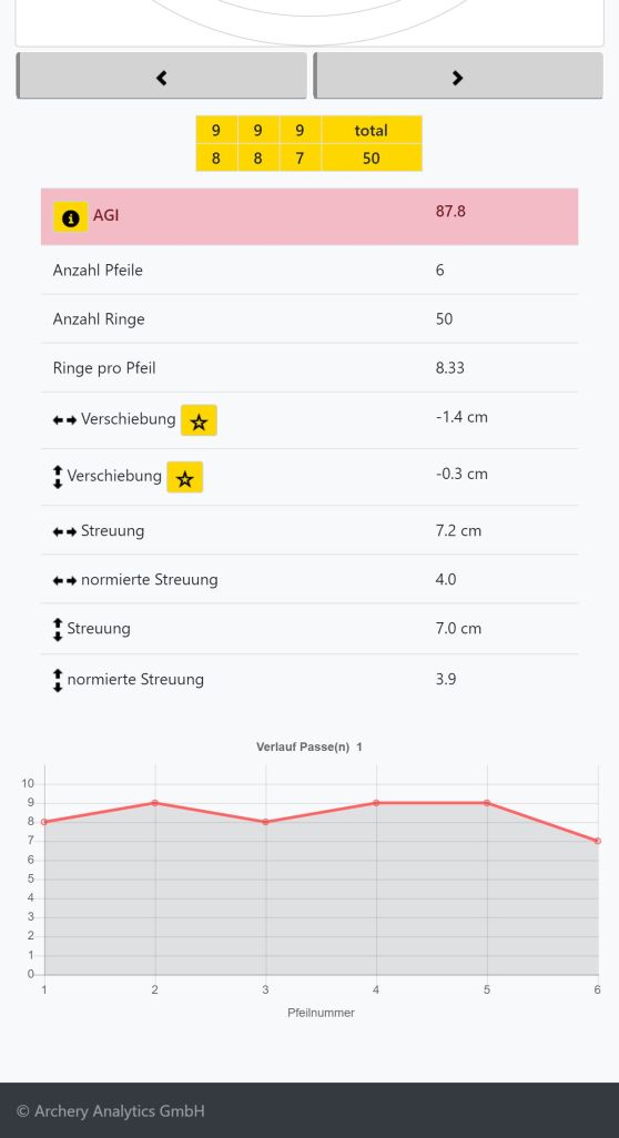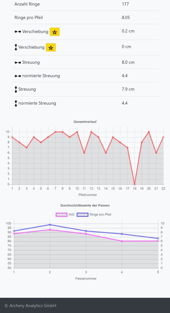 In der Live-Ansicht kannst du jederzeit die wesentlichen Kennzahlen der statistischen Auswertung abrufen, siehe das folgende Beispiel links. Eine genauere Analyse wirst du i.d.R. jedoch erst nach einem Durchgang oder nach dem Training durchführen. Hierfür gibt es die Analyse Ansichten in der RyngDyng App, oder in deinem Account in der Archery Analytics Cloud, wo alle deine erkannten Treffer auch gespeichert werden.