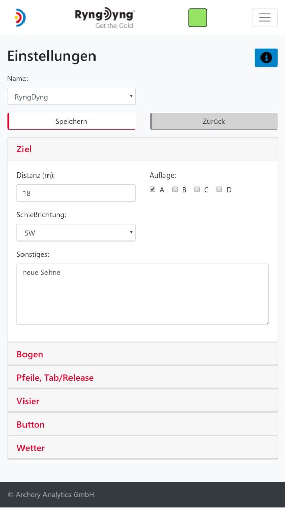 Die Einstellungen betreffen zunächst das verwendete Material. Im persönlichen Account hier auf der Archery Analytics Webseite kannst du beliebig viele Bögen, Pfeile oder Tabs und Releases hinterlegen. Auf dieses angelegte Material greift dann die RyngDyng© App zu und bietet es dir zur Auswahl an. Dazu gibst du dann alle veränderlichen Parameter an, wie z.B. Standhöhe, Visiereinstellungen usw.