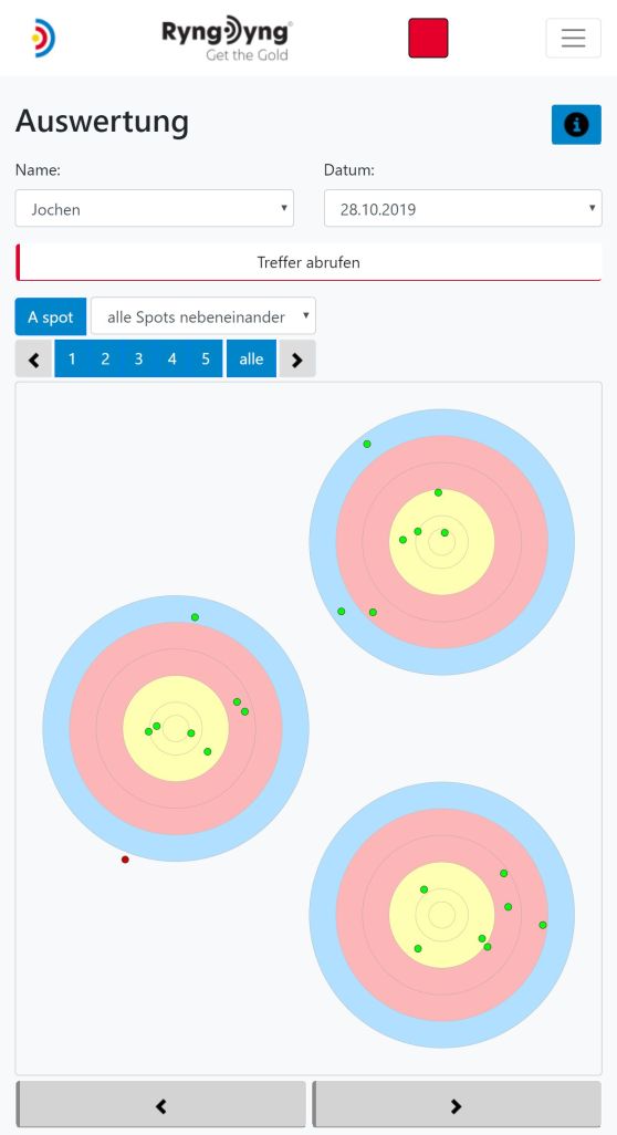 In der Ansicht Auswertung kannst du alle gespeicherten Treffer bereits auf dem Platz analysieren. Besteht eine Verbindung zu einem RyngDyng© , so werden die auf diesem RyngDyng© gespeicherten Treffer abgerufen und angezeigt. Gleichzeitig werden sie in der Datenbank der RyngDyng© App gepspeichert, so dass du sie immer wieder abgerufen kannst. Besteht keine Verbindung zu einem RyngDyng© , so werden die Treffer aus der Datenbank der RyngDyng© App angezeigt. Die RyngDyng App synchronisiert zudem alle gespeicherten Treffer mit deinem persönlichen Account in der Archery Analytics Cloud hier auf diesem Server. Somit können auf dem Server ebenso die Treffer angezeigt und analysiert werden.