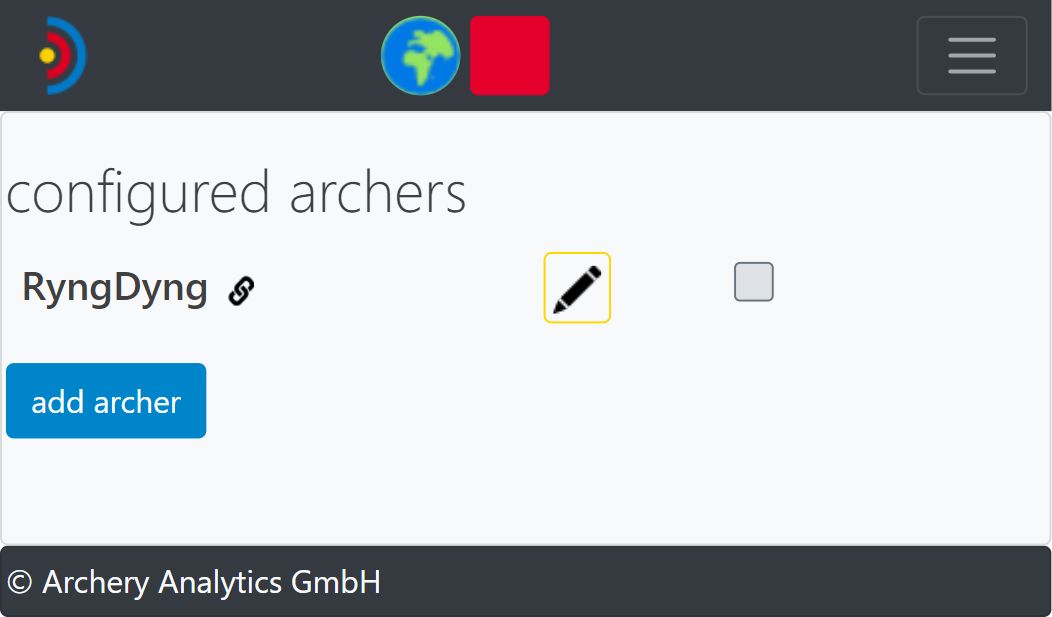 If several archers have been created, they are displayed as a list. An icon behind the name indicates that this person has been linked to the server account. By clicking on the pen symbol, the stored data can be edited or the person can be deleted again. If there is a connection to a RyngDyng, further information is displayed (right image). Clicking on the gear icon takes you to the settings for this person (see below under the heading "Configurations")