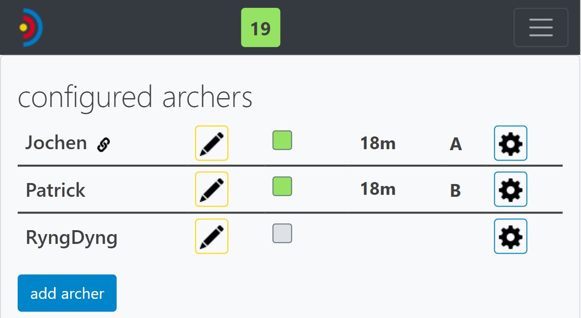 In order to use the full range of functions of the RyngDyng app, archers must be added. Settings can then be stored for these archers and recorded arrows are assigned to the created archers.