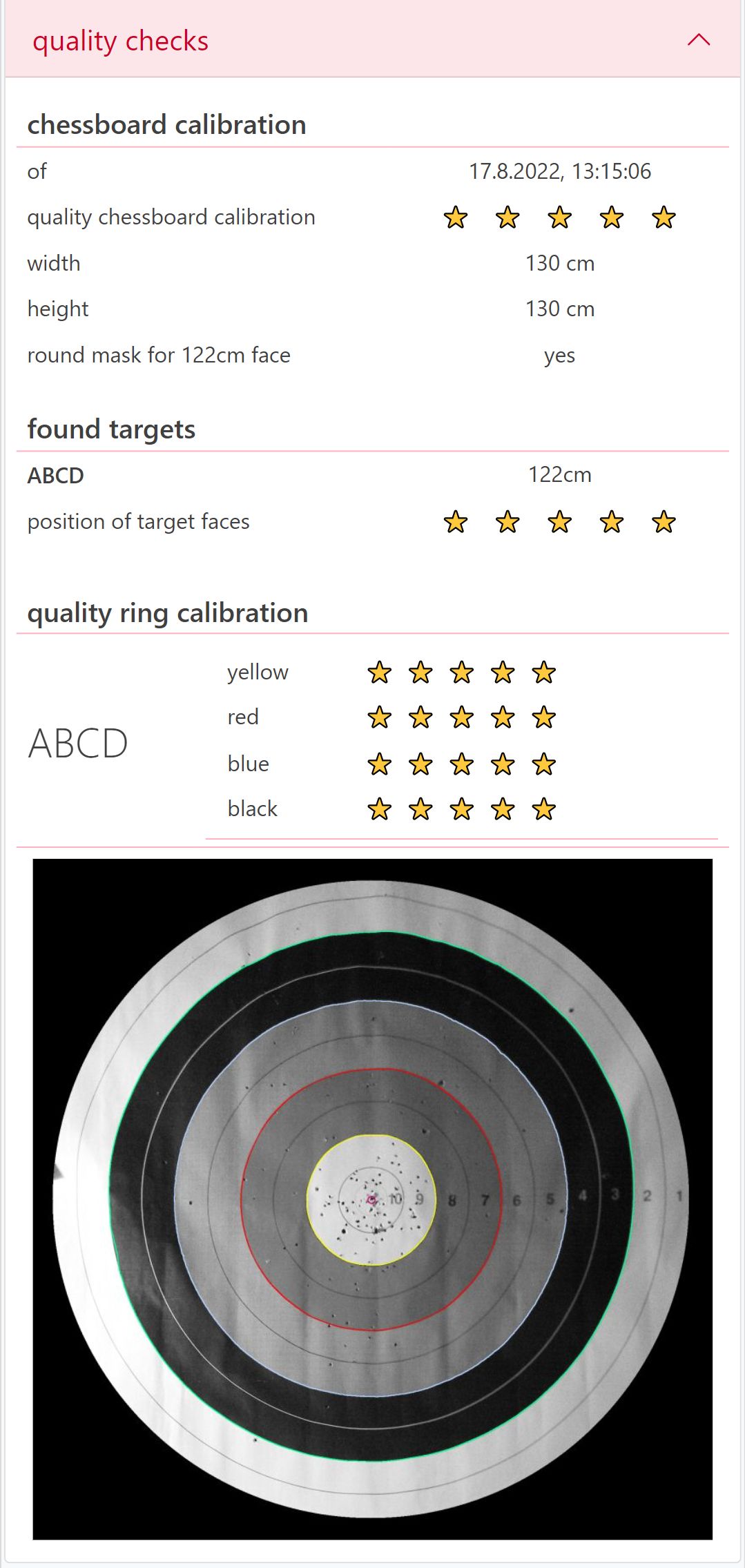 You can check the quality of the calibration at any time in the quality checks section. The left image shows the quality of the chessboard calibration and the faces' positions. After the start of the arrow detection, there is information about the quality of the ring calibration and a control image (right image).