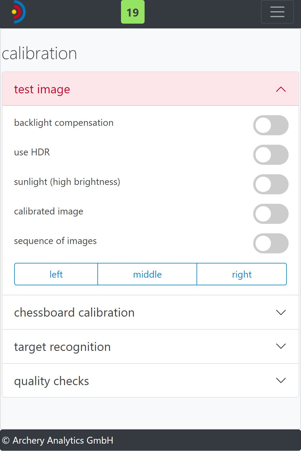 calibrationpage (e.g. to check the quality) - ABCD, AB, CD: Switching like in competition. For example, if the left spot has the letters AC and the right spot has the letters BD, then all arrows are assigned to shooters A (left) and B (right) when AB is active.