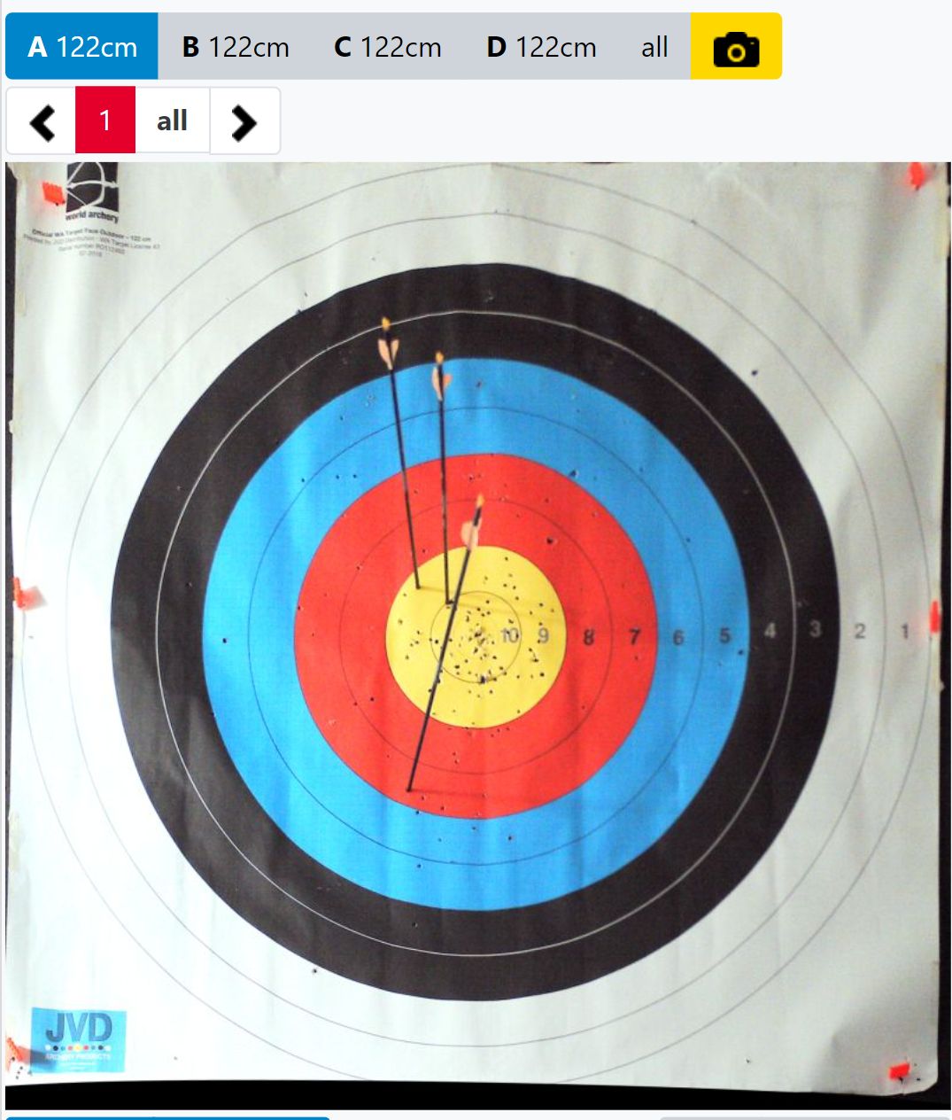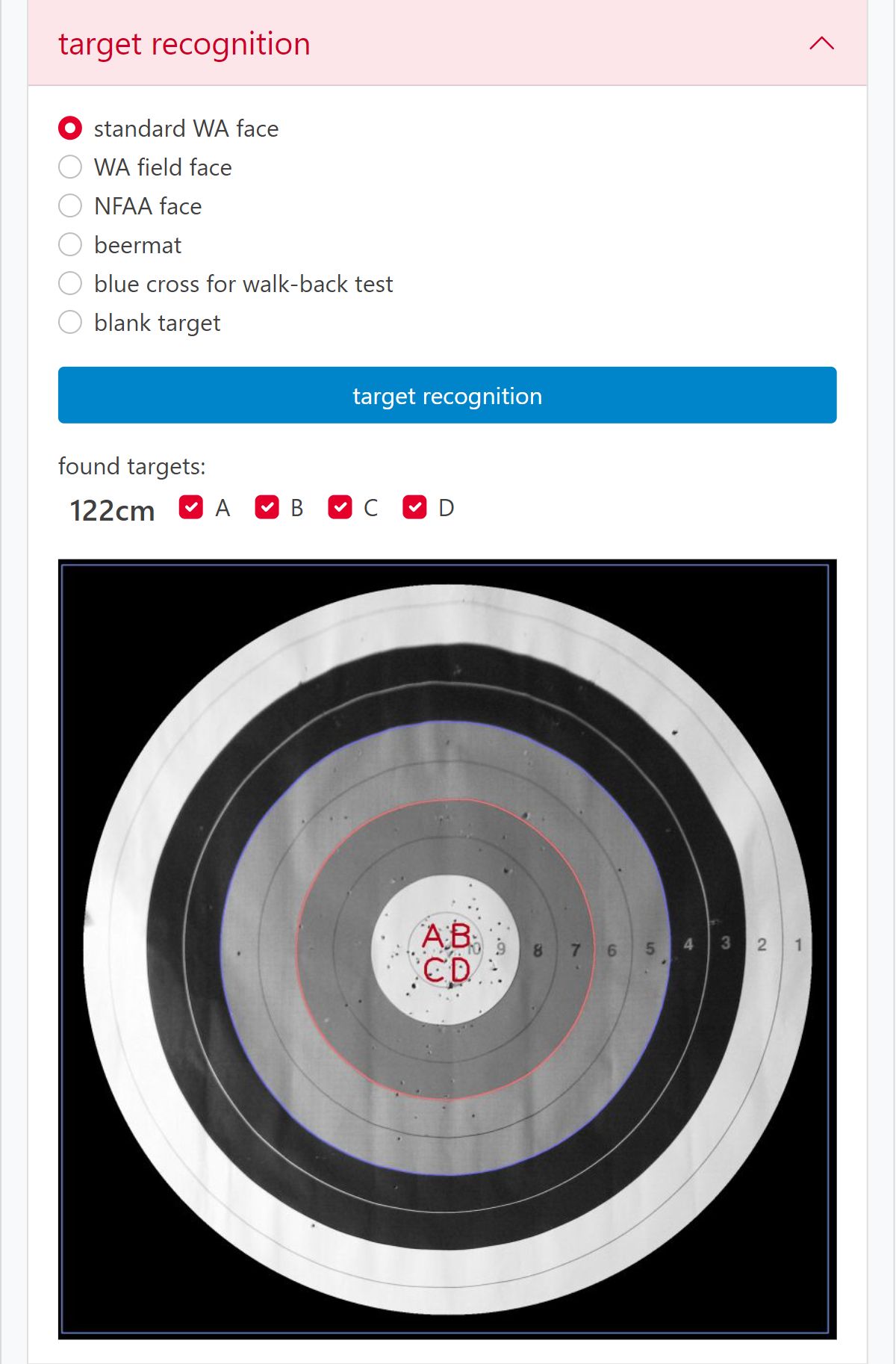 In addition to the standard WA faces with the colors yellow - red - blue, WA and NFAA field faces are recognized. Training with a beer mat as a target marking or with a blank target is also possible. However, arrows with a black shaft are only reliably recognized if the background is not also black. Possibly a light background can be created by attaching a turned 122 face.