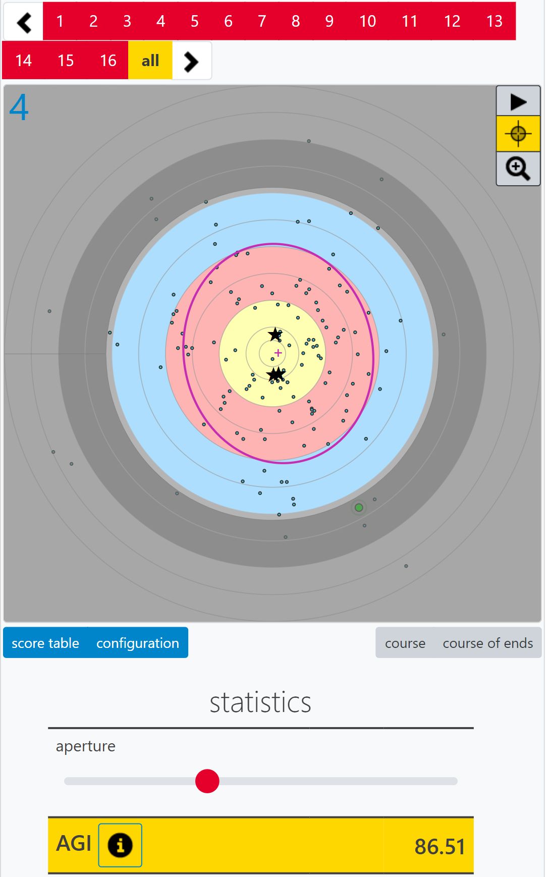 Below the display of the face, the current key figures are also displayed (left image below). All displayed hits are included in the calculation. If several ends are superimposed or if all ends are displayed at the same time, the statistical statements become very significant (e.g. the position of the center point of the arrow group or the Arrow Grouping Indicator AGI). Outliers can be removed from the key figures of the statistics using the slider for the aperture (picture on the right).